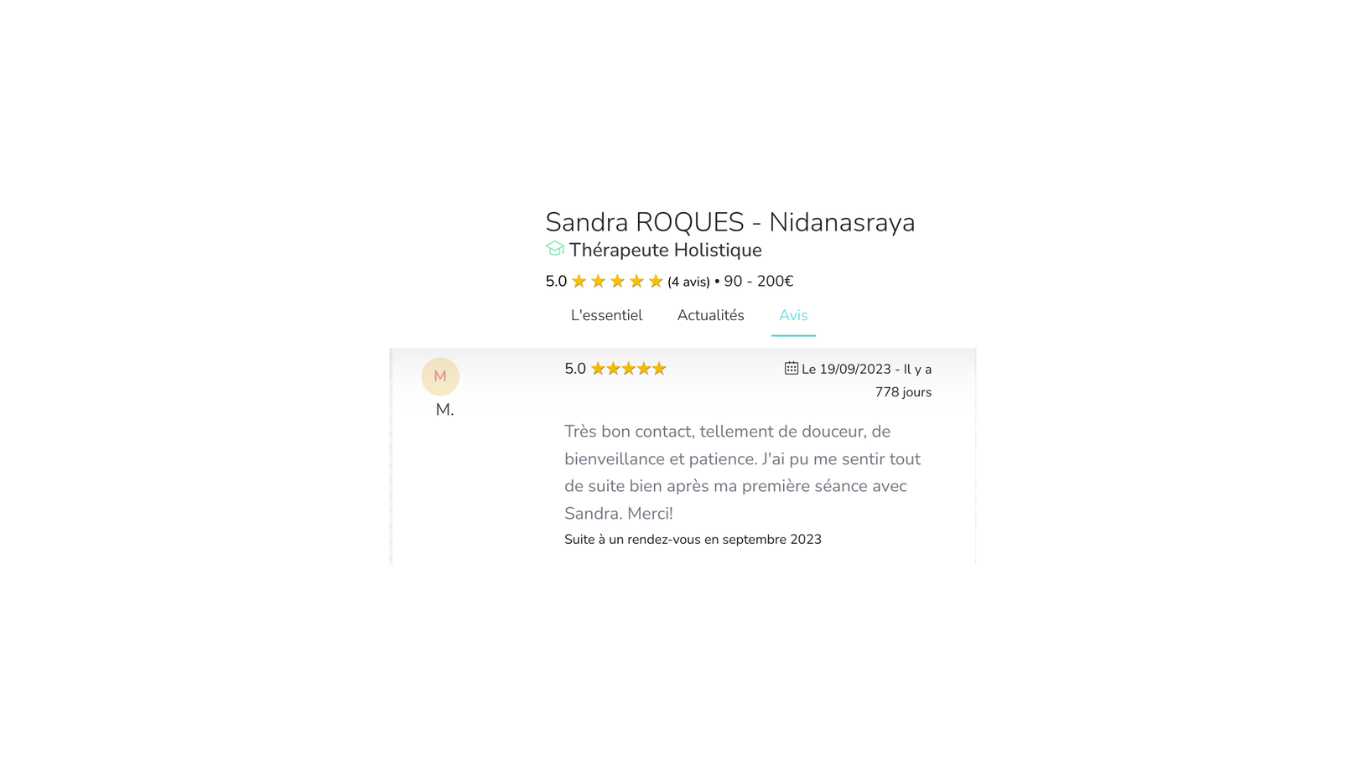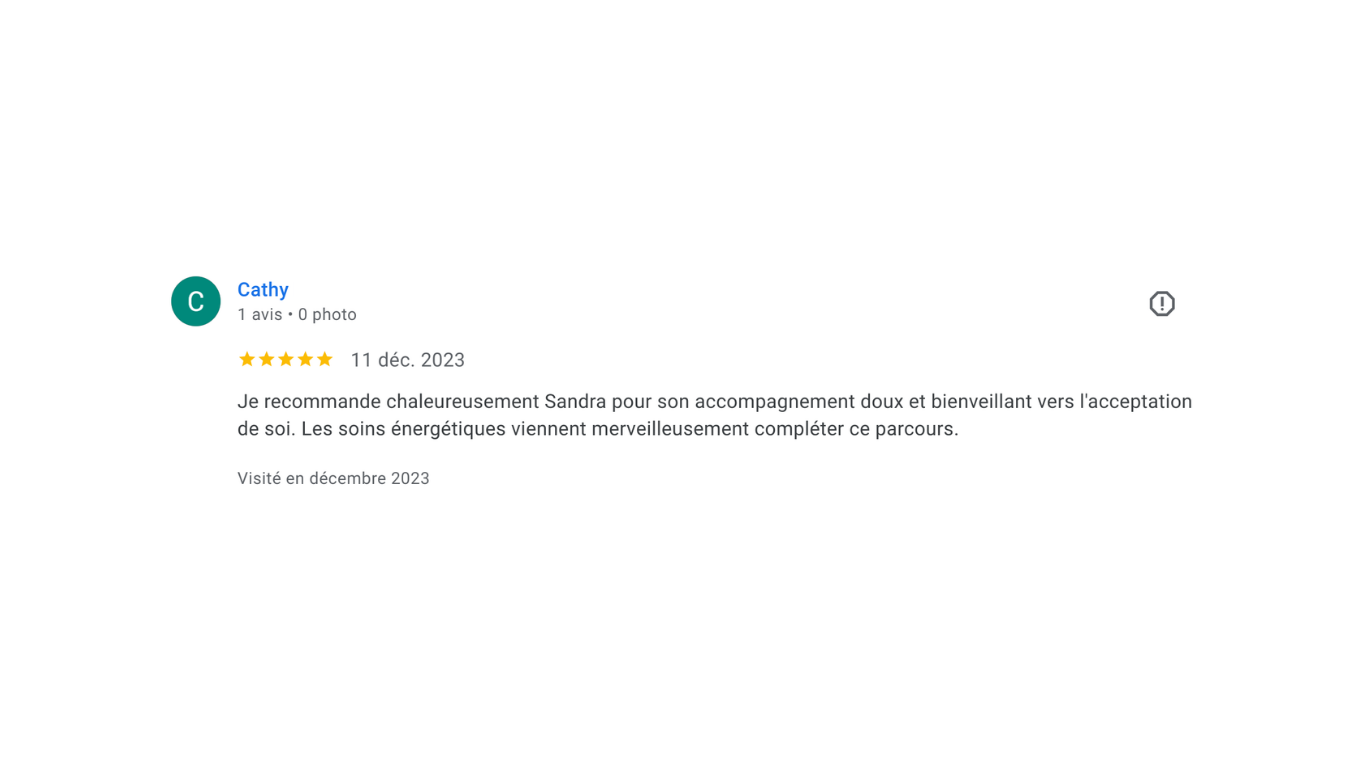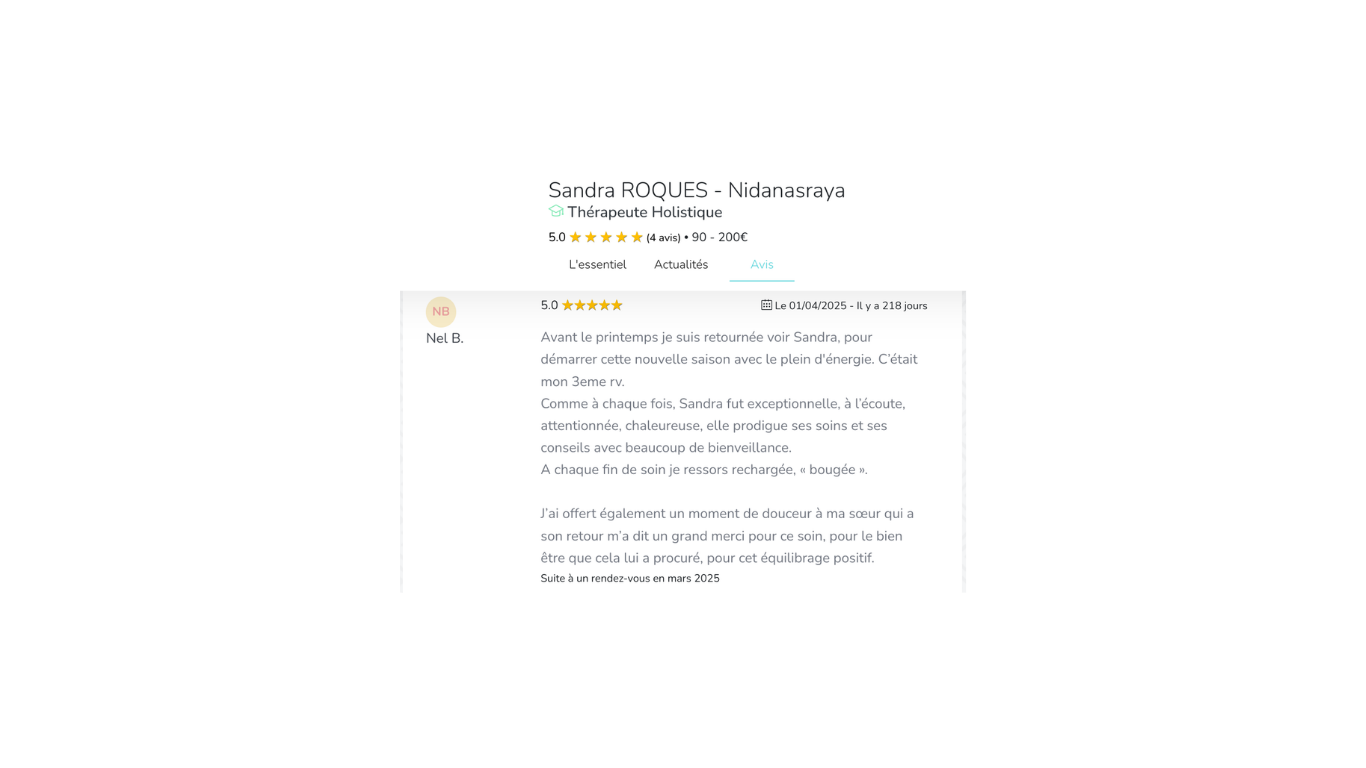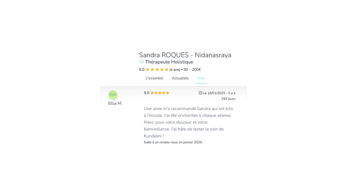 “Sandra m’a aidée à retrouver confiance, énergie et clarté. Chaque séance est un vrai ressourcement.”
